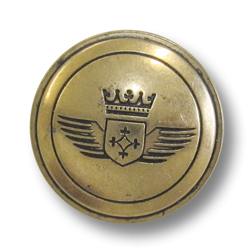 Diese nur leicht gewölbten, altgoldfarbenen Metallknöpfe tragen ein mit einer Krone versehenes Wappenschild, sowie seitlich je eine Vogelschwinge. Diese Knöpfe könnten im Bereich der Luftfahrt ihre Anwendung finden!