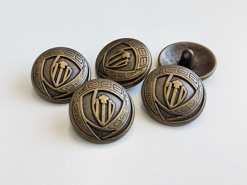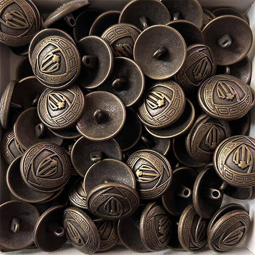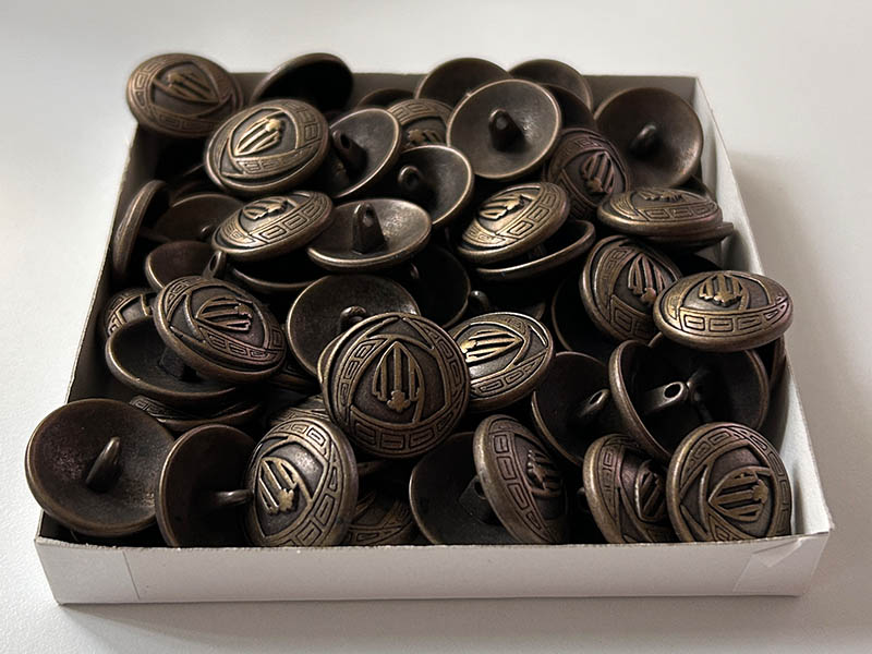 Beschreibung "Altmessingfarbene Metallknöpfe leicht gewölbt mit Öse"