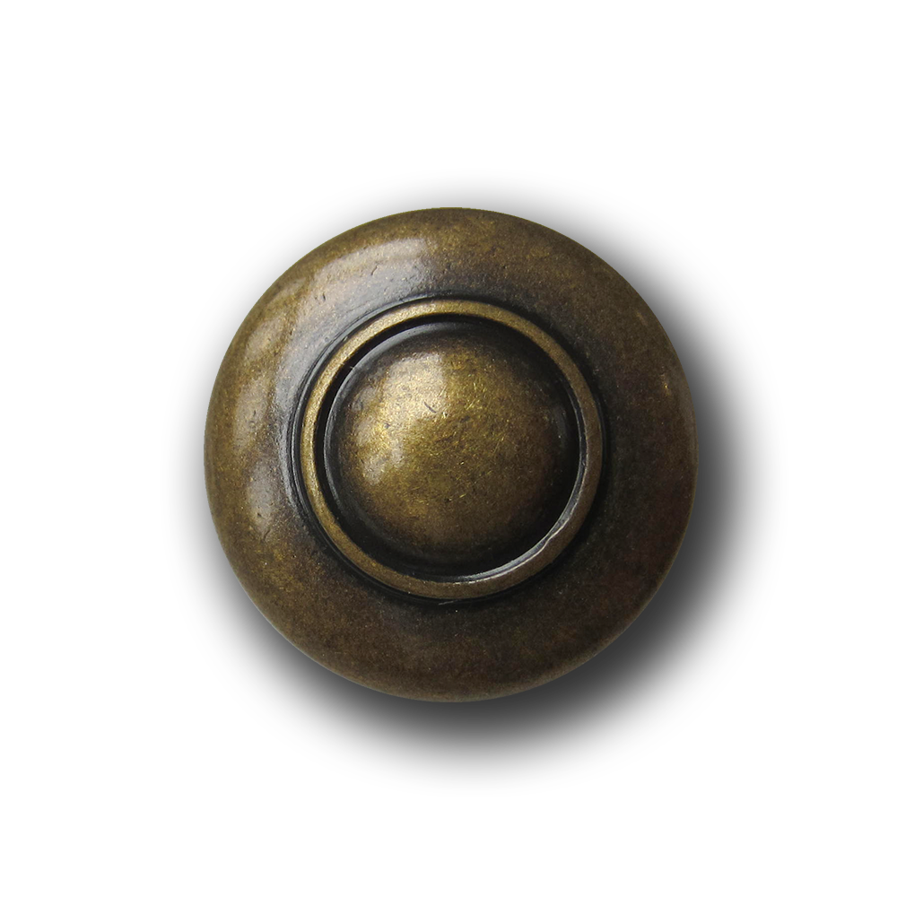 Diese gewölbten, leicht glänzenden altmessingfarbenen Metallknöpfe haben in der Mitte nochmal eine flache, aufgesetzte Kuppel. Auf der Rückseite befindet sich eine Öse zum Annähen.
