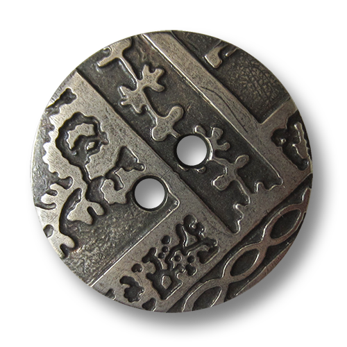 Diese aufregenden Knöpfe sind leicht gewölbt und aus Kunststoff gefertigt. Die Kunststoffknöpfe sind altsilberfarben geschwärzt. Die Oberfläche ist über und über mit unterschiedlichen Muster überzogen wie Ranken, Rosen und Welllenlinien, die verschachtelt angeordnet sind und durch breite Stege in einzelne Flächen aufgeteilt sind, dadurch wirkt er unkonventionell und etwas unruhig. Ansonsten haben die Knöpfe zwei Knopflöcher zum Annähen.