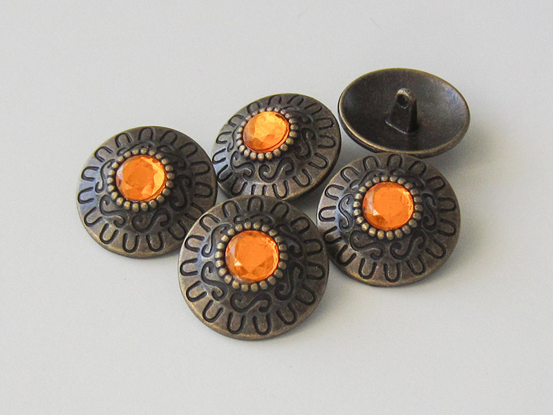 Beschreibung "Ausgefallen schöne Metallknöpfe in altmessing mit orangefarbenen Glitzerstein in der Mitte"