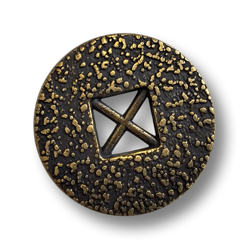 Diese Knöpfe bestehen aus Metall und sind relativ schwer. Die Metallknöpfe sind altmessingfarben und flach und haben eine interessant strukturierte Oberfläche. Die Metallknöpfe haben außerdem ein interessantes Knopflochdesign: in der Mitte befindet sich ein quadratischer Ausschnitt, der durch gekreuzte Querstreben in 4 Knopflöcher geteilt wird. Die interessanten Metallknöpfe sind ein außergewöhnliches Accessoire an Mänteln, Jacken, Taschen oder Kostümen.