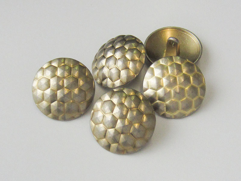 Diese besonders schönen Metallknöpfe sind messing- und leucht durchschimmernd silberfarben und echte Hingucker. Der angesagte Bi-Color Effekt lässt die Knöpfe älter wirken als sie sind. Die Metallknöpfe haben eine Öse zur Befestigung und sind auf der Vorderseite sanft gewölbt. Das Besondere an diesen Metallknöpfen ist ihre Oberfläche: Zu Waben zusammen gesetzte Dreiecke in unterschiedlichen Winkeln verleihen den Knöpfen eine dreidimensionale Oberfläche, die schön anzusehen und anzufassen ist.