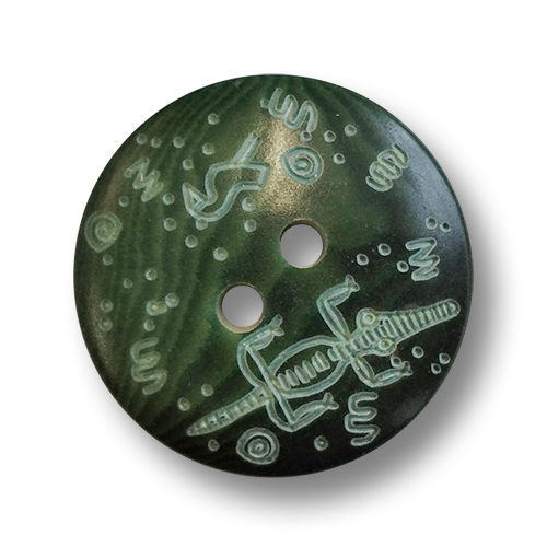 Diese interessanten Knöpfe bestehen aus Steinnuss und sind dunkelgrün eingefärbt. Die Steinnussknöpfe haben zwei Löcher und zeigen auf ihrer Vorderseite ein interessantes Lasermuster, das an eine Kinderzeichnung erinnert und ein Krokodil, einen kleinen Vogel, kleine Spiralen und Kreise zeigt. Die dunkelgrünen Steinnussknöpfe wirken herbstlich und jung.