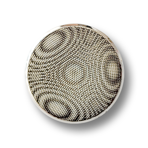 Diese eleganten Knöpfe bestehen aus Kunststoff und sind deswegen besonders leicht. Die Kunststoffknöpfe sind glänzend silberfarben, sind etwas dicker und haben auf der Rückseite eine Öse an der sie befestigt werden. Die Kunststoffknöpfe haben eine strukturierte Vorderseite, die fast an Stoff erinnert, während der Rand mit Schnörkeln verziert ist.