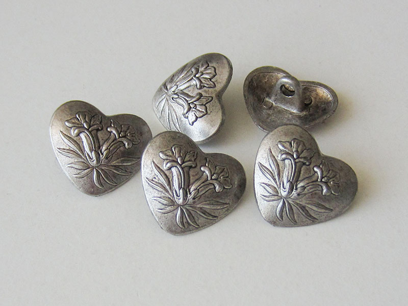 Beschreibung "Bezaubernde altsilberfarbene Metallknöpfe in Herz Form mit zwei Enzian Blüten"