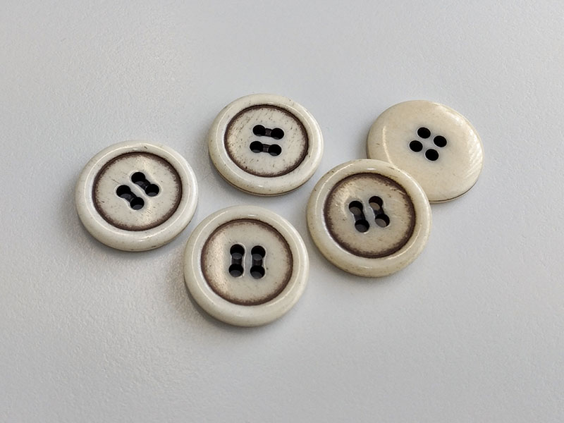 Diese Knöpfe bestehen aus Bein und sind deswegen relativ schwer. Die beinernen Knöpfe sind braun eingefärbt und haben vier Knopflöcher und einen nur ganz leicht erhabenen Rand.
