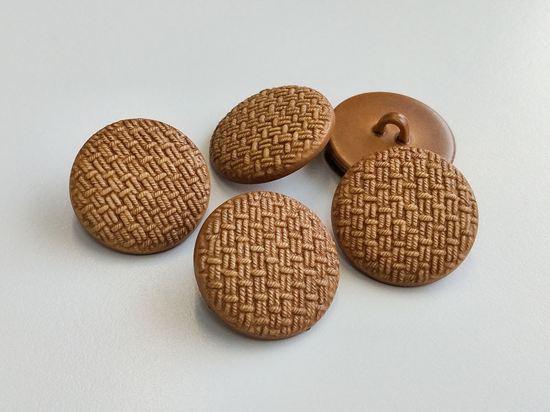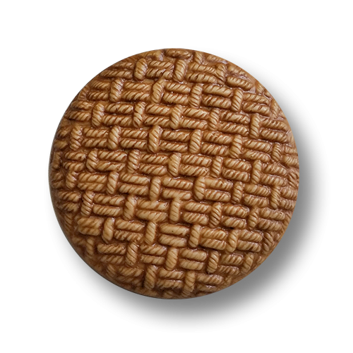 Diese Knöpfe bestehen aus Kunststoff und haben einen warmen, mittel- bishellbraunen Farbton. Die Kunststoffknöpfe haben eine leicht gewölbte Vorderseite, die fast aussieht als wäre sie mit grob gewebtem Stoff bespannt. Die Kunststoffknöpfe eignen sich wunderbar für Strickjacken, Landhausmode, als Accessoire an Kuschelpullovern oder Taschen.