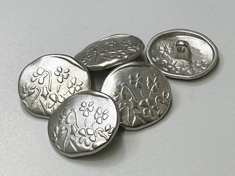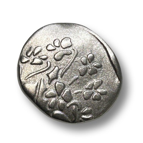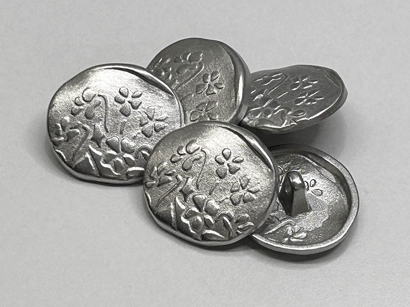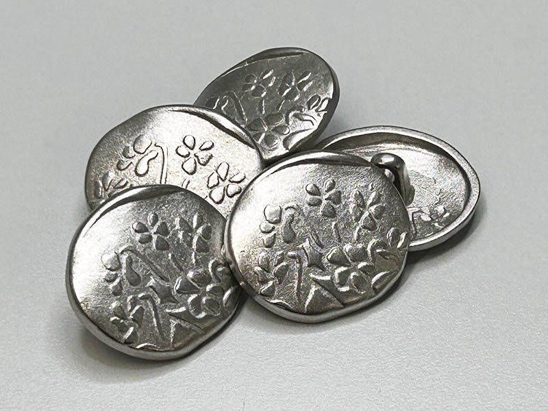 Beschreibung "Verspielte, unrunde Metallknöpfe in Silber mit Blumenmotiv und Ösenbefestigung"