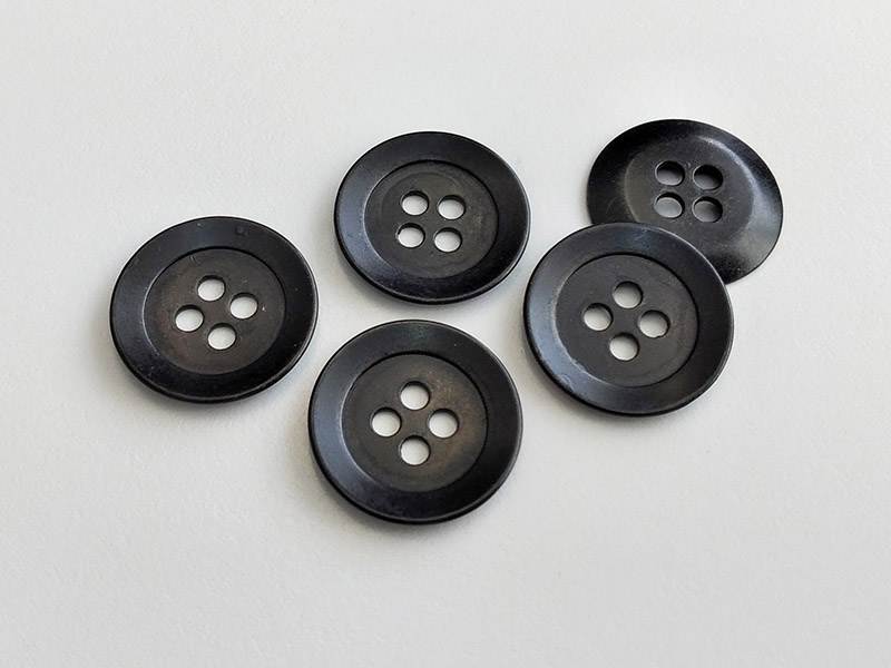 Beschreibung "Dunkel eisenfarbene, dünne Metallknöpfe mit vier Löchern und schrägem Rand"