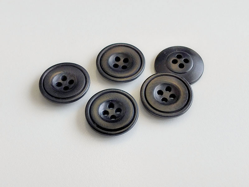 Beschreibung "Dunkelblaue, fast schwarze Steinnussknöpfe mit vier Löchern und schmalem Rand"