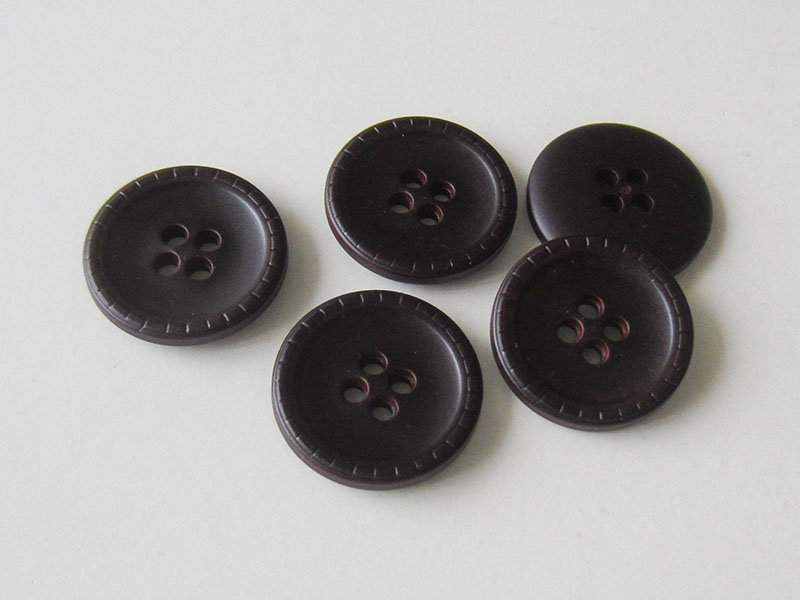 Diese interessanten Kunststoffknöpfe sind dunkelbraun und haben eine leicht nach innen gewölbte Knopfmitte. Der Rand der Knöpfe besteht aus einem leicht erhöhten Ring, der in gleich große Abschnitte unterteilt ist. Die Kunststoffknöpfe erinnern ein wenig an Lederknöpfe mit Steppnaht am Rand. Ansonsten haben die Knöpfe vier Knopflöcher zum Annähen