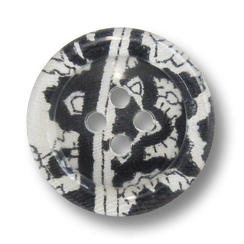 Diese hübschen Knöpfe sind aus Kunststoff gefertigt und haben eine weiße Grundfarbe mit abstraktem schwarzem floralem Muster. Dabei fällt das Muster bei jedem Knopf anders aus. Tatsächlich sind die Knöpfe eigentlich transparent mit einer eingearbeiteten weiß-schwarzen Einlage in der Mitte, die durchschimmert. Die Form der Kunststoffknöpfe ist ganz klassisch mit flacher Knopfmitte und wulstigem Rand. Ansonsten haben die Knöpfe vier Knopflöcher zum Annähen.