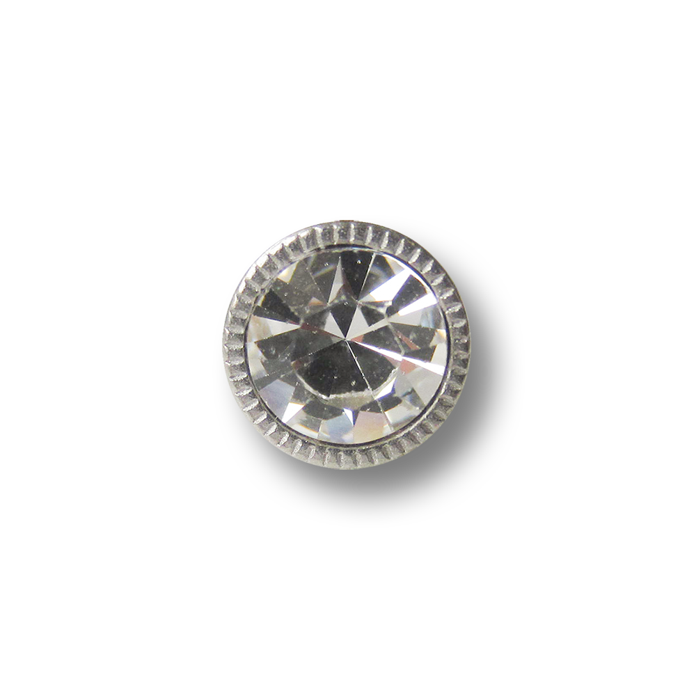 Diese kleinen silberfarbenen Metallknöpfe sind matt silberfarben und haben eine becherartige Form mit edlem schraffiertem Rand und eingesetztem echten Glasstein. Der Glasstein ist aufwendig facettiert geschliffen und funkelt faszinierend in kristallweiß. Ansonsten befindet sich auf der Rückseite eine Öse zum Annähen.