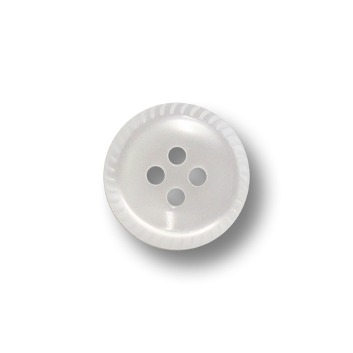 Diese hübschen kleinen weißen Knöpfe haben eine edle Perlmuttoptik, sind aber aus unempfindlichen Kunststoff gefertigt. Die Oberfläche der Kunststoffknöpfe ist leicht nach innen gewölbt und der Rand hat eine edles Kranz-Muster, das wie gekördelt aussieht. Ansonsten haben die Knöpfe vier Knopflöcher zum Annähen.