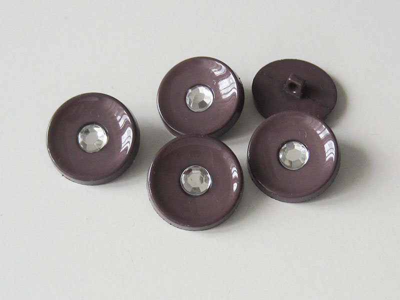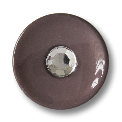 Diese hübschen Kuntstoffknöpfe sind glänzend taupefarben und leicht nach innen gewölbt. Der Clou ist ein kristallweiß facettierter Schmuckstein in der Mitte der Knöpfe. Der Rand ist schlicht und um 90 Grad abfallend. Ansonsten haben die Knöpfe auf der Rückseite eine Öse zum Annähen.