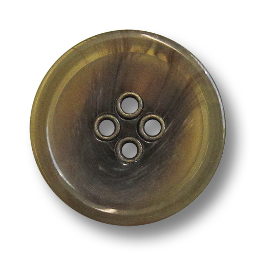Diese etwas dickeren Kunststoffknöpfe haben ein zeitloses Design. Die Kunststoffknöpfe sind nur ganz sanft nach innen gewölbt und haben einen schmalen Rand, in der Mitte haben sie vier Löcher, die durch messingfarbenes Metall verstärkt wurden. Die Kunststoffknöpfe haben einen herbstlichen Farbton, der braun und olivefarben gemasert ist und sehr natürlich wirkt.