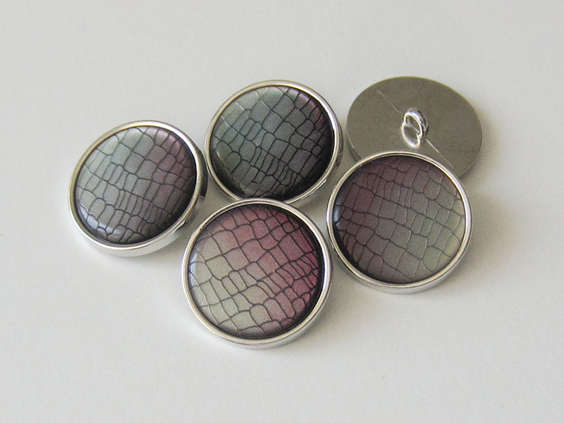 Diese tollen Knöpfe bestehen aus einem silberfarbenen Metallträger und einer perlmuttartig grauen Kunststoffeinlage. Die Einlage zeigt ein eingeprägtes Reptil-Muster und die Farbe changiert leicht im Farbverlauf von Grau bis Lila. Ansonsten befindet sich auf der Rückseite eine Öse zum Annähen.
