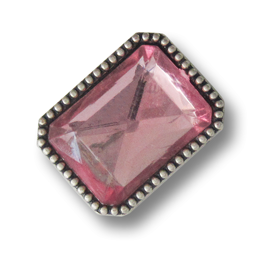 Diese auffälligen Metallknöpfe bestehen aus einem altsilberfarbenen Träger und einem auf der Oberfläche aufgeklebten Schmuckstein in Rosa. Der Zierstein ist erhöht und facettiert und wird von einem metallischen Zierband in Altsilber aus plastischen hervortretenden Punkten eingerahmt. Die Form der Schmuckknöpfe ist viereckig mit abgeschnittenen Ecken. Beeindruckende Metallknöpfe als Kostümknöpfe, Schmuckknöpfe, Zierknöpfe, Bastelknöpfe, Jackenknöpfe, Taschenknöpfe und vieles mehr.