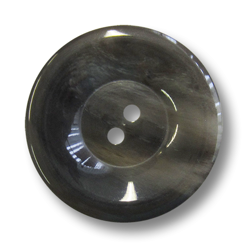 Diese schlichten Kunststoffknöpfe sind glänzend grau meliert und Ihre Form erinnert an einen Teller. Die Knopfmitte ist abgesenkt und der Rand ist breit und nach außen hin ansteigend. Ansonsten haben die Knöpfe zwei Knopflöcher zum Annähen.
