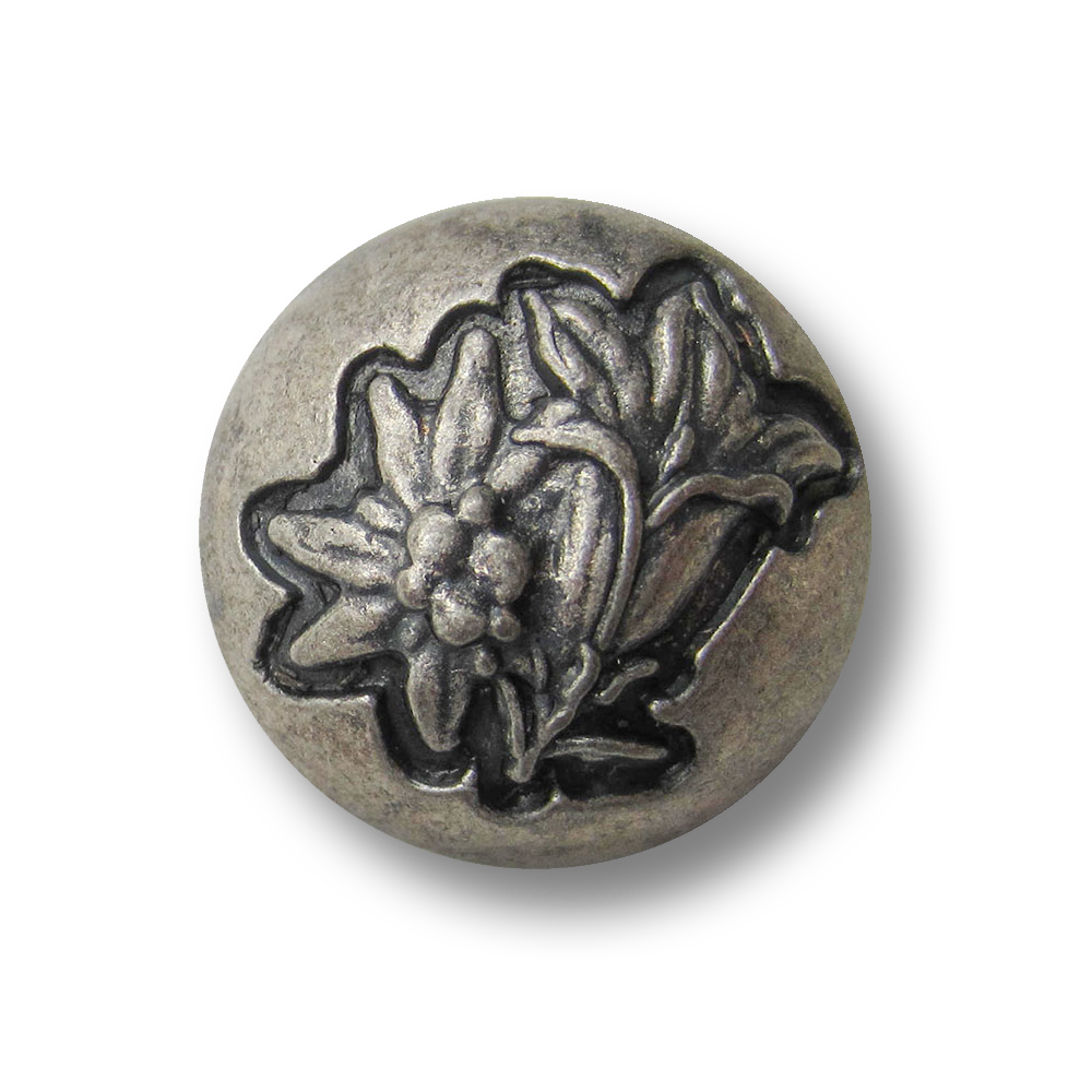 Diese eindrucksvollen großen, matt altsilberfarbenen bis eisenfarbenen Metallknöpfe sind stark gewölbt und haben die Form einer Halbkugel. Sie zeigen als Motiv eine Enzianblüte und ein Edelweiß, die reliefartig angelegt sind. Eingerahmt werden sie von einer tiefergelegten Linie, die den Umriss des Motivs nachzeichnet und zur Kostrastierung dunkel unterlegt ist. Ansonsten befindet sich auf der Rückseite noch eine Öse zum Annähen.