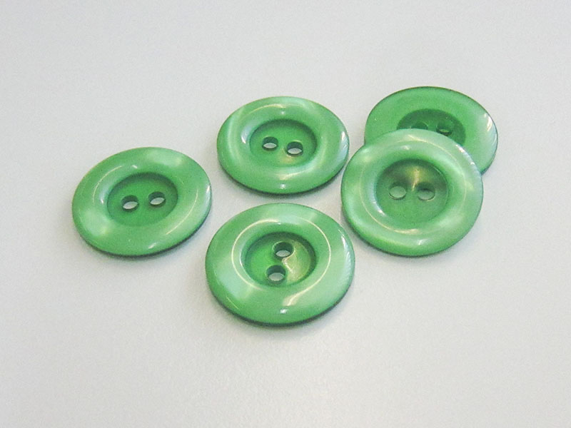 Beschreibung "Grün schimmernde Kunststoffknöpfe mit breitem Rand und zwei Löchern"