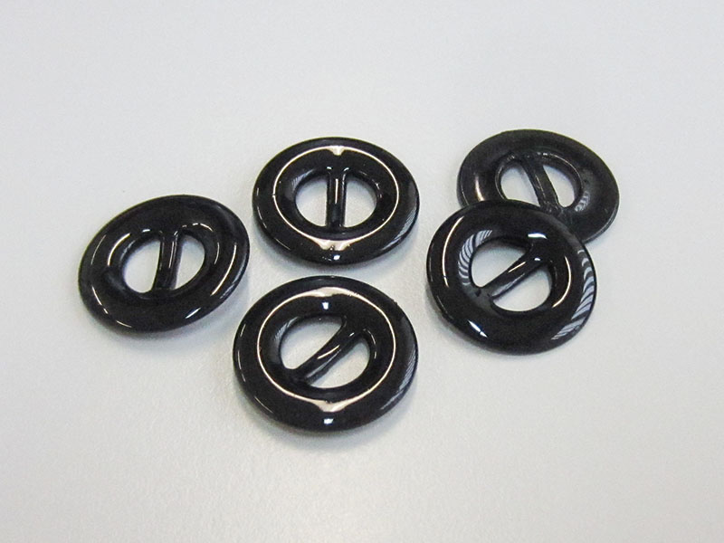 Diese sehr leichten Kunststoffknöpfe bestehen eigentlich nur aus einem breiten Rand und einem verbindenen Steg. Die Kunststoffknöpfe sind glänzend schwarz.