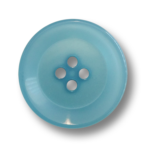 Diese leichten und günstigen Kunststoffknöpfe haben vier Löcher und einen breiten, leicht nach innen abfallenden Rand. Die Kunststoffknöpfe schimmern elegant und ihr Farbton ist je nach Lichteinfall eine Mischung aus Türkis und gedecktem Mittelblau.