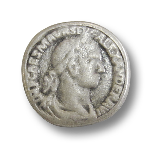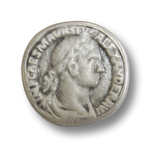 Diese relative schweren und dicken Metallknöpfe sind alten römischen Münzen nachempfunden. Die wie von Hand geprägt wirkende Vorderseite der Münzknöpfe zeigt die Büste Alexanders mit Lorbeerkranz und die Inschrift: IMP CAES M AVR SEV ALEXANDER AVG. Die Münzknöpfe sind altsilberfarben und haben auf der Rückseite eine Öse, an der sie befestigt werden. Die Metallknöpfe sind nicht ganz rund - genau wie die alten römischen Münzen. Die Knöpfe eignen sich hervorragend für historische Kostüme, sind aber auch ein edles Accessoire an Mänteln ohne historischen Bezug.
