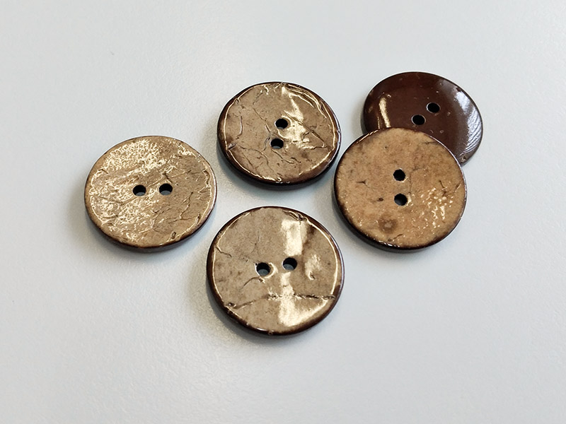 Diese leichten Knöpfe bestehen aus Kokosnussschale und haben zwei Löcher. Die Kokosnussknöpfe sind flach und sind beige auf der Vorderseite, dunkelbraun auf der Rückseite. Die Kokosnussknöpfe sind lackiert und glänzen deswegen.