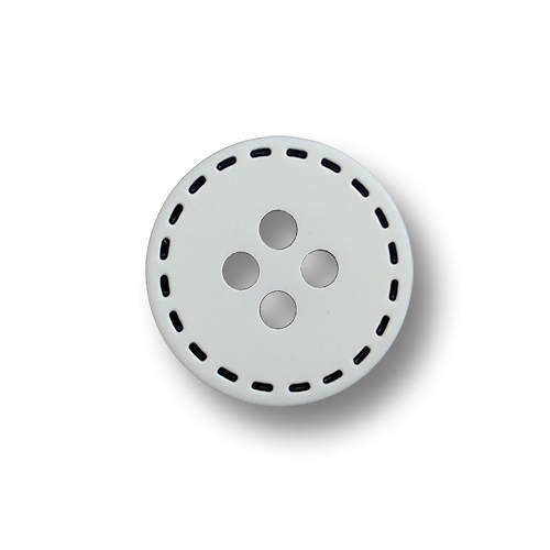 Diese hübschen, flachen Knöpfe bestehen aus Kunststoff und haben vier Löcher. Die Oberfläche dieser Kunststoffknöpfe ist weiß, während die Basis der Knöpfe blau ist. Die Kunststoffknöpfe zeigen einen Rand aus Strichen, was ingesamt an eine Ziernaht erinnert.