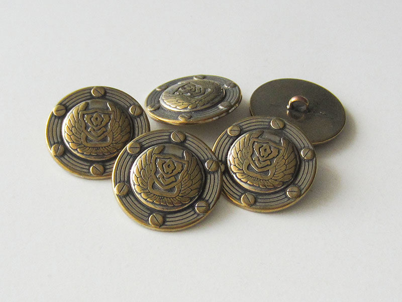Beschreibung "Imposante Metall Ösen Knöpfe in Bicolor mit Wappen, Flügeln & Schrauben"