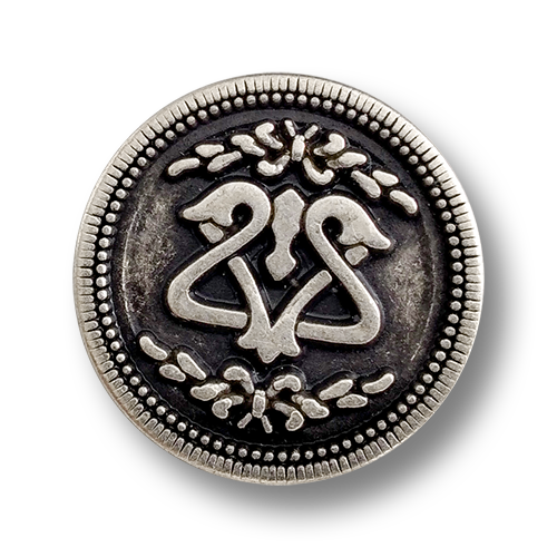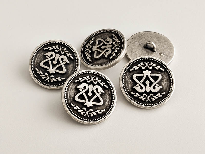 Diese interessanten Knöpfe bestehen aus Metall und sind altsilberfarben. Die Metallknöpfe haben eine Öse auf der Rückseite und zeigen auf der Vorderseite ein gerahmtes Motiv. Die altsilberfarbenen Metallknöpfe sind sehr hübsch.