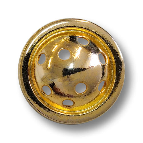 Diese Metallknöpfe sind etwas schwerer und glänzend goldfarben. Die Metallknöpfe haben auf der Rückseite eine Öse an der sie angenäht werden können. Die Vorderseite der Knöpfe hat einen abgesetzten Rand und eine gewölbte Mitte. In der Mitte dieser Metallknöpfe befindet sich simples Durchbruchmuster aus ungleichmäßig vertielten, runden Löchern.