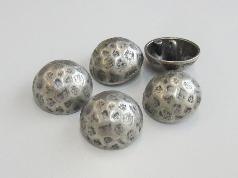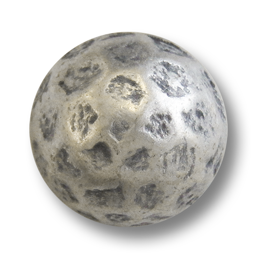 Dieser besonders interessante Metallknopf hat eine recht starke Wölbung (ca. 11mm wölbt er sich hoch!). Er wirkt, als sei er von einem alten Schmied gehämmert worden. Die dadurch entstandenen Flächen haben kleine Vertiefungen, die schwarz gefärbt sind. Ein sehr plastischer und attraktiver Knopf, meine ich! Denselben Knopf biete ich auch etwas dunkler an. Beide Knöpfe sind - abgesehen von der Helligkeit des Grundmaterials - identisch.