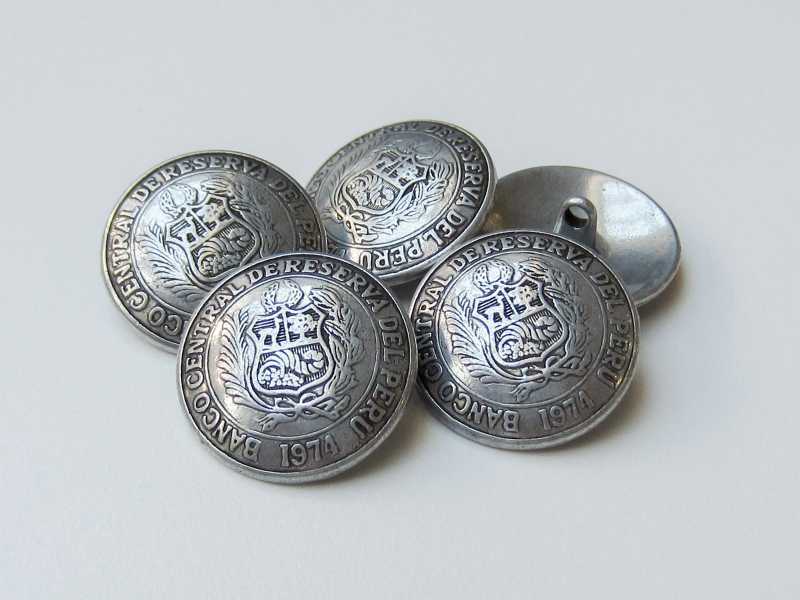 Diese leicht gewölbten stahlfarbenen (silber mit mit bläulichem Schimmer) Metallknöpfe zeigen die Nachbildung der Rückseite einer berühmten peruanischen Münze. Die Münze heißt: Peru 1/2 Sol de Oro 1974. Das detailreiche Münzmotiv zeigt das peruanische Staatswappen. Dieses Wappen ist dreigeteilt und zeigt eine Art von Lama, einen Chinarindenbaum und ein großes Füllhorn. Flankiert wird das Wappen von zwei üppigen Zweigen oder Büschen und über dem Wappen schwebt ein Lorbeerkranz. Gesäumt wird das Motiv von einem Ring, der in großen Buchstaben den folgenden Schriftzug trägt: BANCO CENTRAL RESERVA DEL PERU 1974. Auf der Rückseite des Knopfes befindet sich eine Öse zum Annähen.