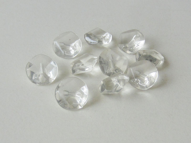 Diese hübschen transparenten Knöpfe sehen aus wie edle Glasknöpfe, allerdings sind sie aus leichtem Kunststoff gefertigt. Die Knöpfe haben eine facettierte Oberfläche, die im Licht besonders schön reflektiert. Die Knöpfe erinnern an einen Edelstein bzw. Diamant. Auf der Rückseite der Knöpfe befindet sich eine Öse zur Befestigung.