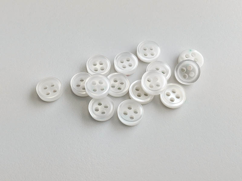 Diese kleinen Knöpfe bestehen aus Kunststoff, sehen aber fast aus wie Perlmuttknöpfe. Die kleinen Kunststoffknöpfe haben vier Löcher und einen Rand. Die Knöpfe eignen sich wunderbar als Blusenknöpfe, Kinderknöpfe, Puppenknöpfe - oder natürlich zum basteln und dekorieren.