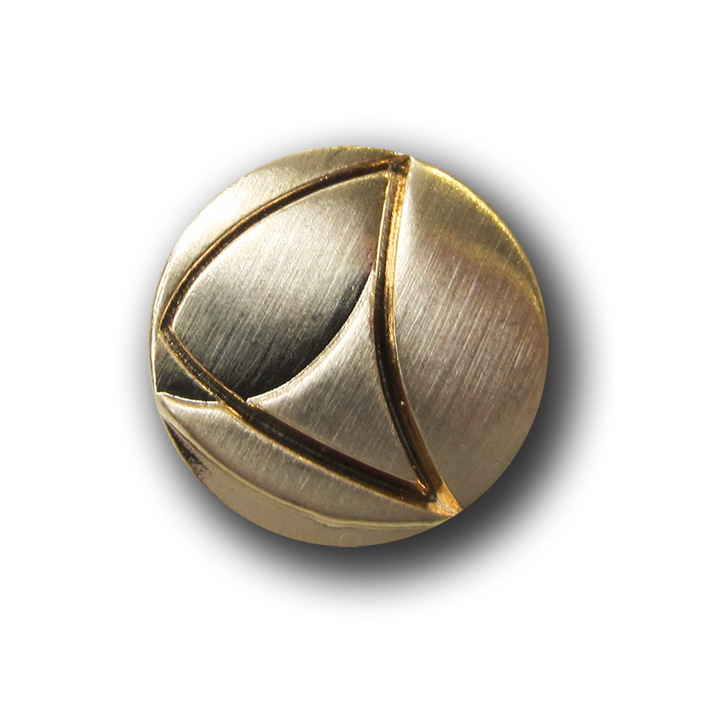 Diese kleinen matt goldfarbene Metallknöpfe sind leicht gewölbt, die Oberfläche wirkt ein wenig wie gebürstet und zeigt ein abstraktes graphisches Muster aus vertieften Linien. Auf der Rückseite befindet sich eine Öse zum Annähen.