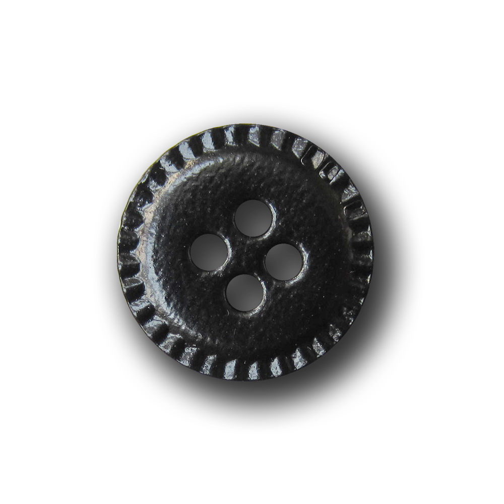 Diese schlichten tablettenförmigen Vierlochknöpfe sind leicht schwarz glänzend und haben einen gezackten Rand. Ansonsten haben sie vier Knopflöcher zum Annähen.