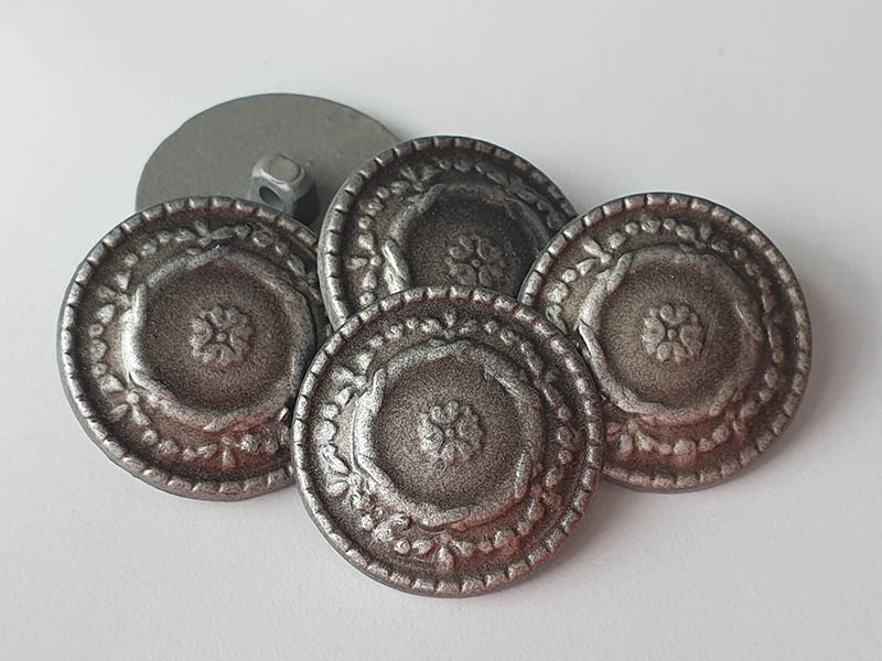 Diese Kunststoffknöpfe in matt altsilberfarbener Optik wirken wie antikes Metall