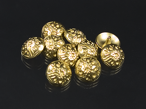 Das Muster dieser matt goldfarbenen Halbkugelknöpfe wirkt sehr dezent. Es sind vertiefte Rillen und Punkte, die man als abstraktes Blütenmuster beschreiben könnte. Ihre Wölbung beträgt stolze 6mm