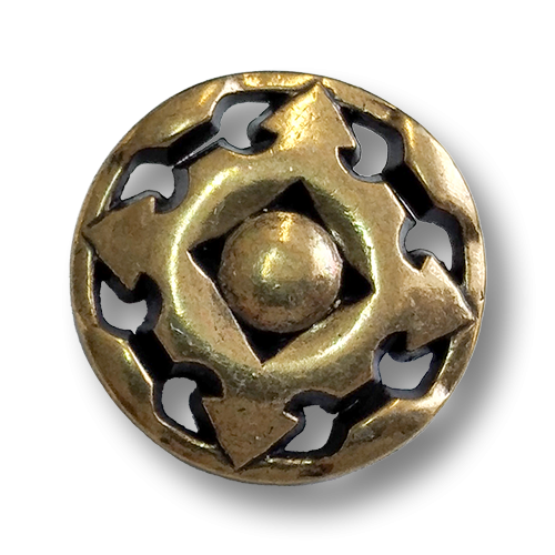 Diese Knöpfe bestehen aus Metall und sind messingfarben. Die Metallknöpfe zeigen ein plastisches Durchbruchmuster und haben auf ihrer Rückseite eine Öse an der sie befestigt werden.