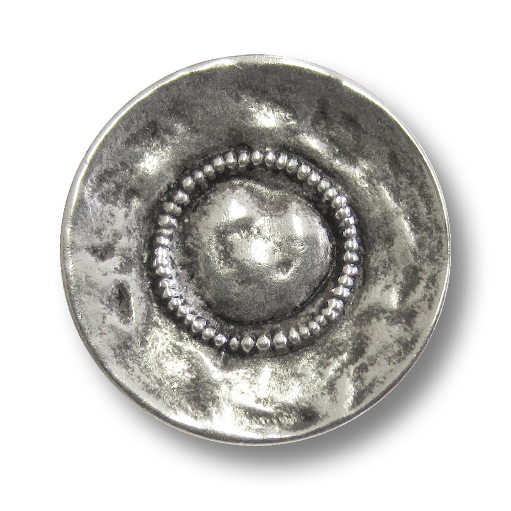 Diese leicht tellerförmig nach innen gewölbten Knöpfe wirken doch wirklich uralt, finden Sie nicht auch? Wenn man ganz genau hinschaut, kann man im gepunkteten Ring ein stilisiertes Herz erkennen. Auf der Rückseite befindet sich eine Öse zum Annähen!