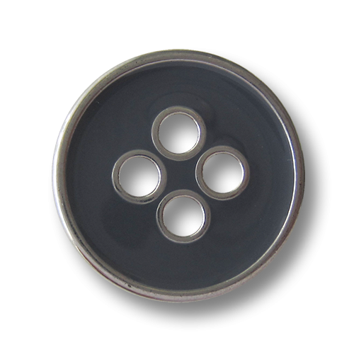 Diese flachen Metallknöpfe bestechen durch ihre Schlichtheit, wodurch sie echte Klassiker sind. Die Basisfarbe ist glänzend silber, die wie Emaille wirkende Oberfläche ist glänzend grau. Ansonsten haben die Knöpfe vier große Knopflöcher zum Annähen und einen leicht erhöhten, schmalen Rand.