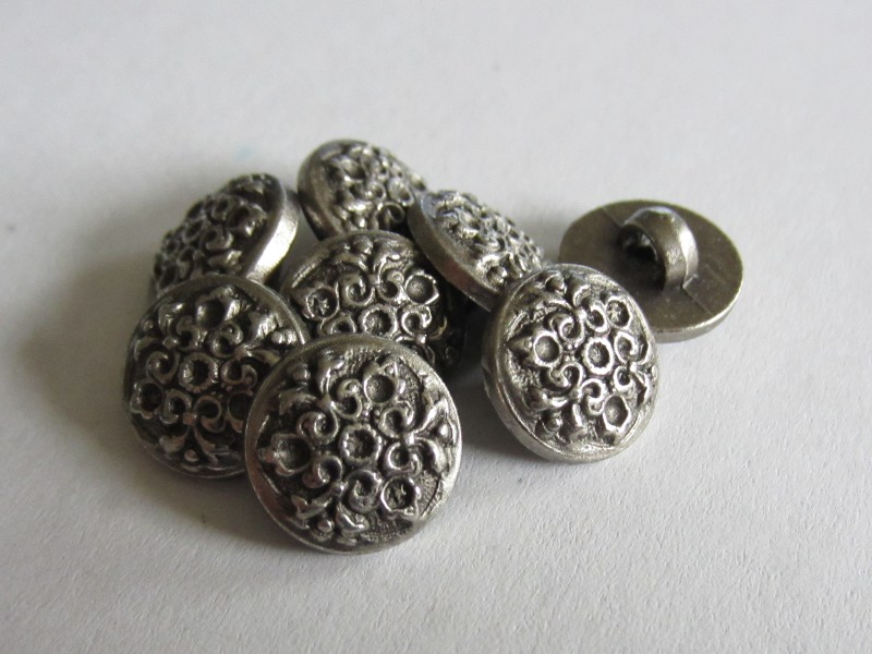 Beschreibung "Restposten: 8 kleine Knöpfe – Kunststoff – matt-silber – rund – ca.14mm – Öse"