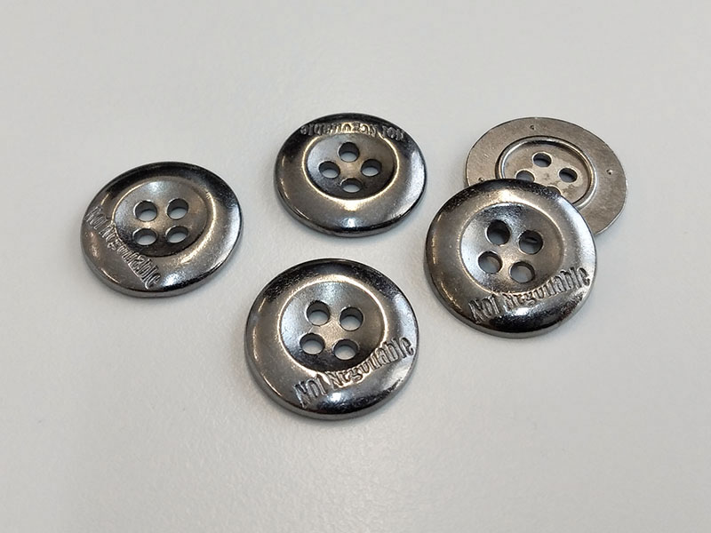 Diese schlichten, runden Metallknöpfe sind chromfarben und haben vier Löcher zum Annähen. Ihre Knopfmitte ist flach abgesenkt. Der Rand der Knöpfe ist erhöht, in einem schwachen Bogen zum äußeren Rand hin abfallend. Auf dem Rand der Metallknöpfe ist außerdem ein Schriftzug "Not Negotiobale" zu lesen. Die Knöpfe sind relativ schwer und massiv und passen perfekt zu Jeansstoff.