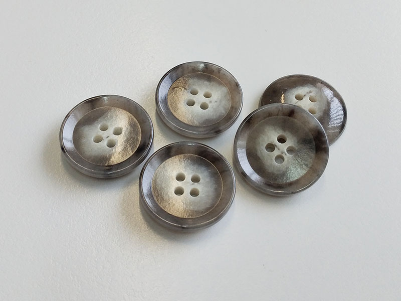 Diese Knöpfe bestehen aus Kunststoff, erinnern aber optisch an Büffelhornknöpfe. Die Kunststoffknöpfe haben vier Löcher und einen schrägen, abgesetzten Rand. Die Vierlochknöpfe sind beige-braun-grau gemasert oder marmoriert und wirken unaufgeregt und schlicht.