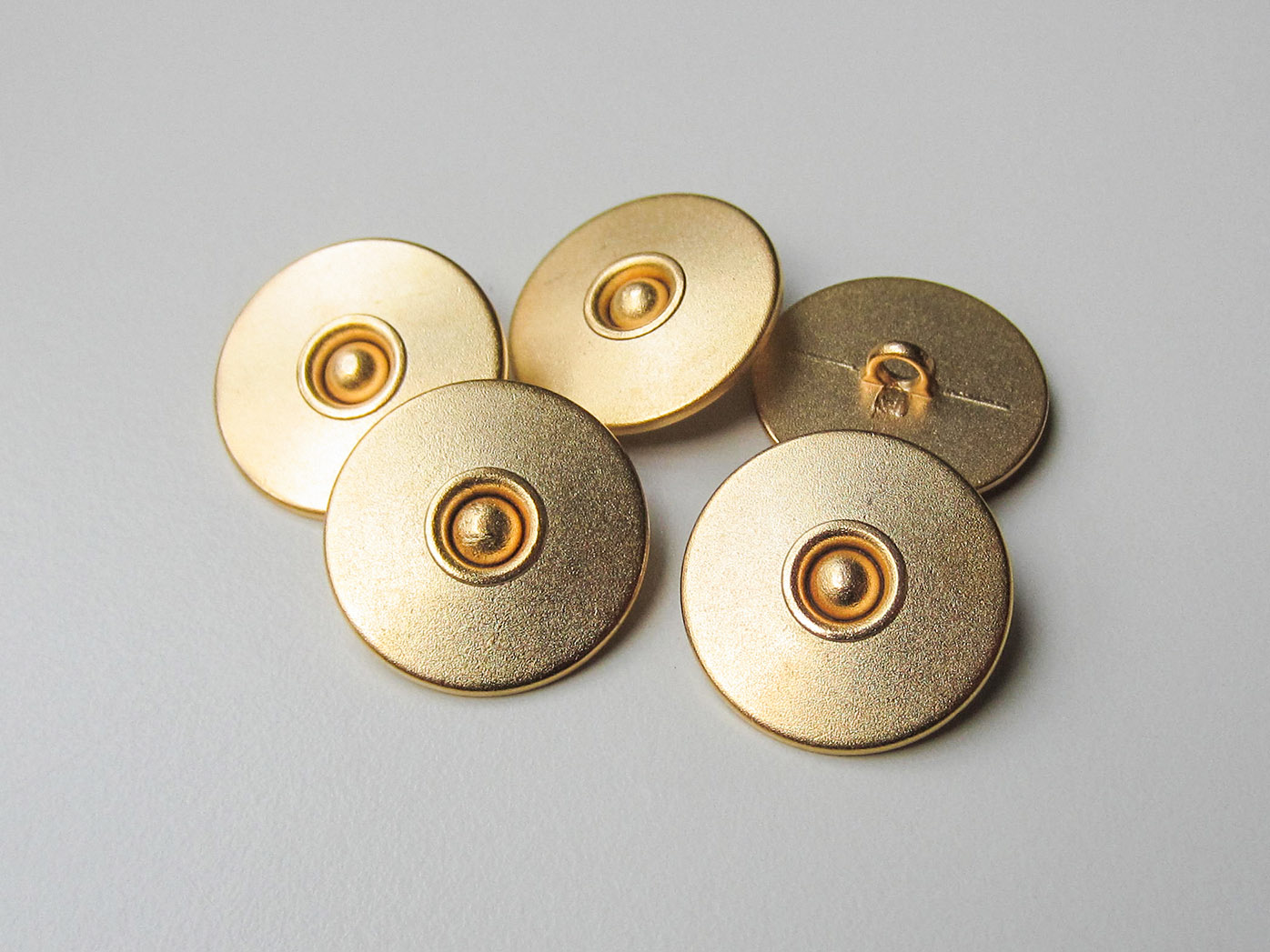 Diese matt goldfarbenen Metallknöpfe sind leicht gewölbt und haben in der Mitte eine Vertiefung, die von einer kleinen Kugel ausgefüllt wird und durch einen minimal erhöhten Rand eingerahmt wird. Auf der Rückseite befindet sich eine Öse zum Annähen.