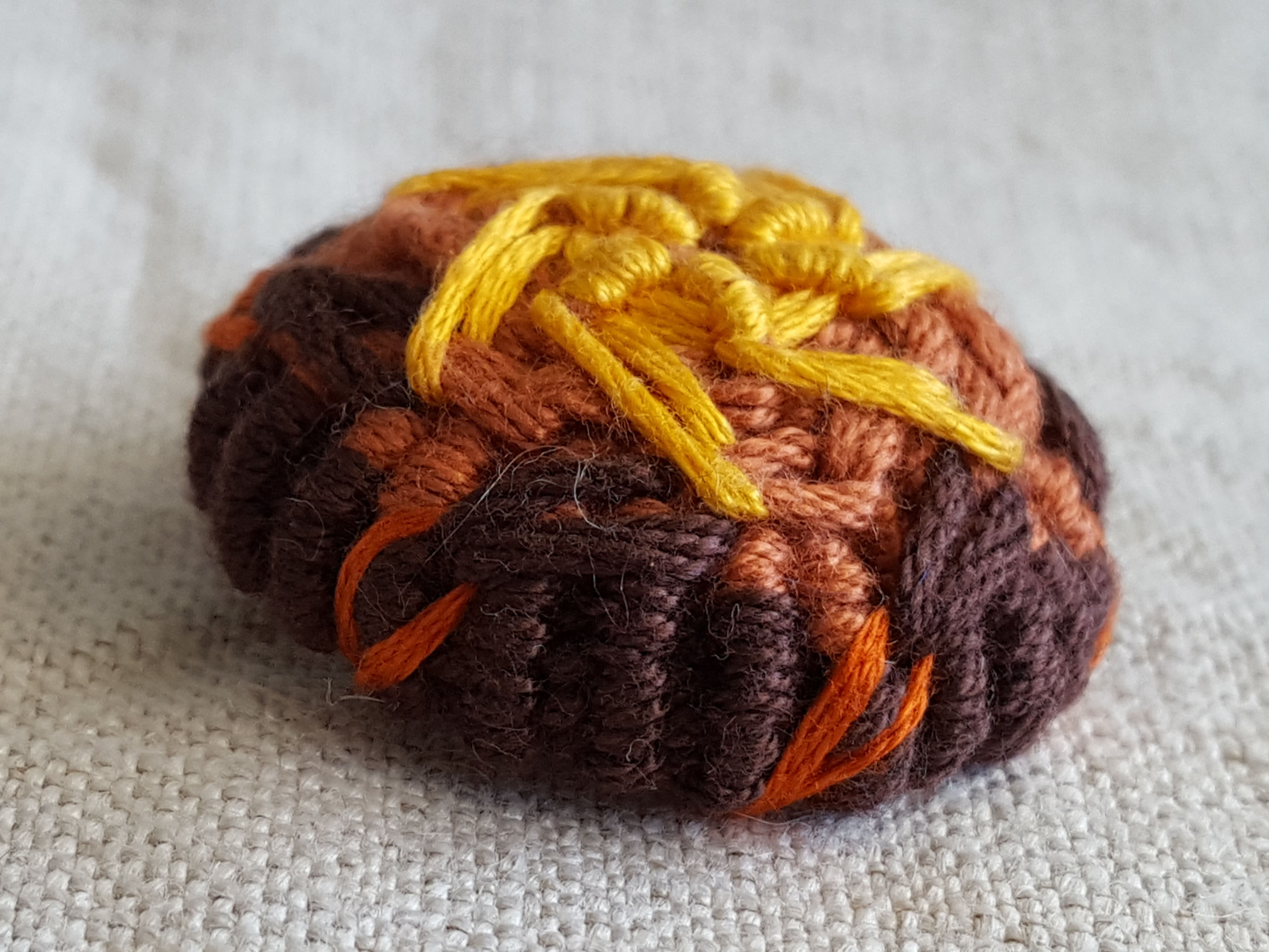 Beschreibung "Schön gemusterter Posamentenknopf in Herbsttönen, handmade, Handarbeit, Unikat"